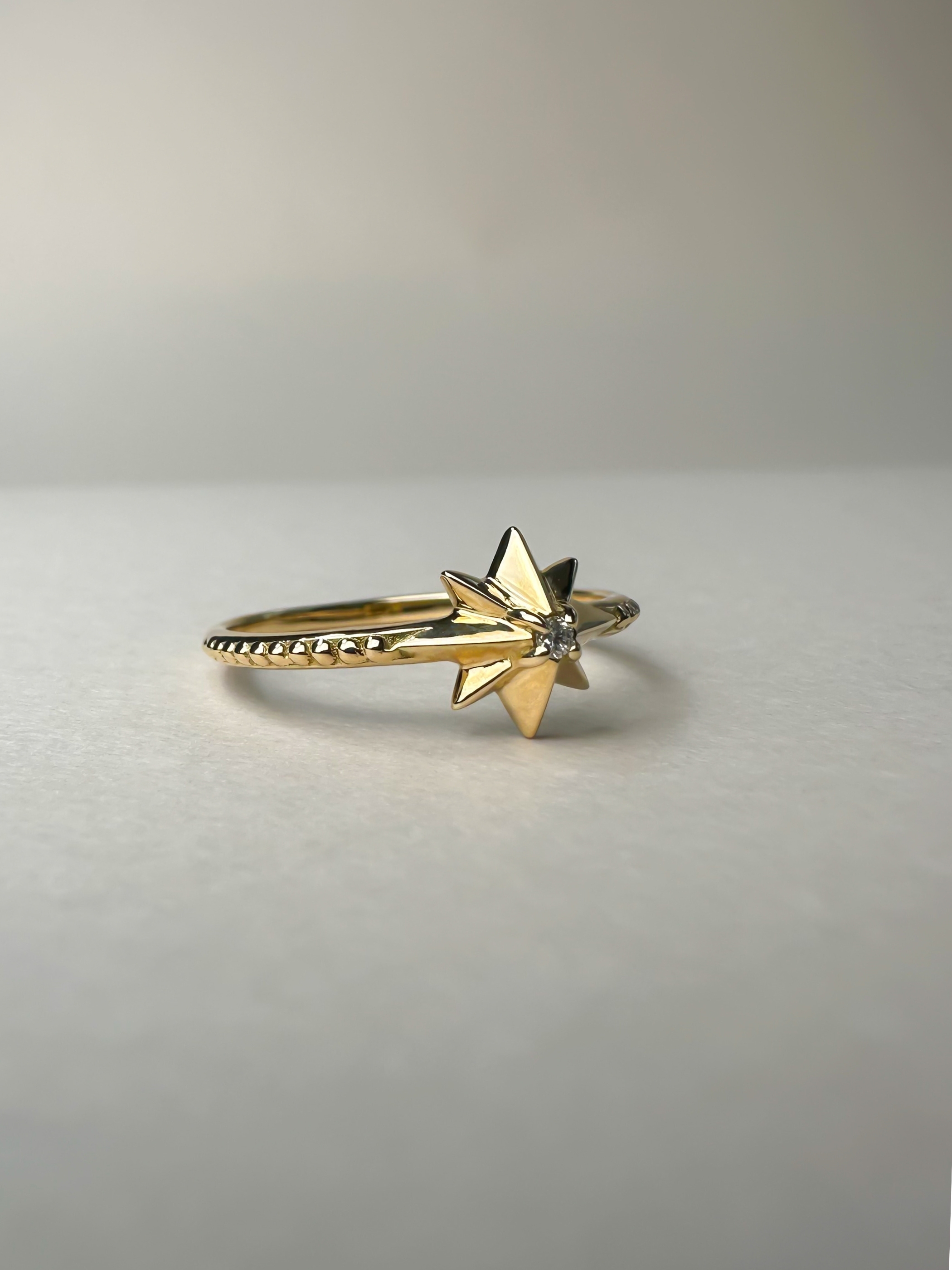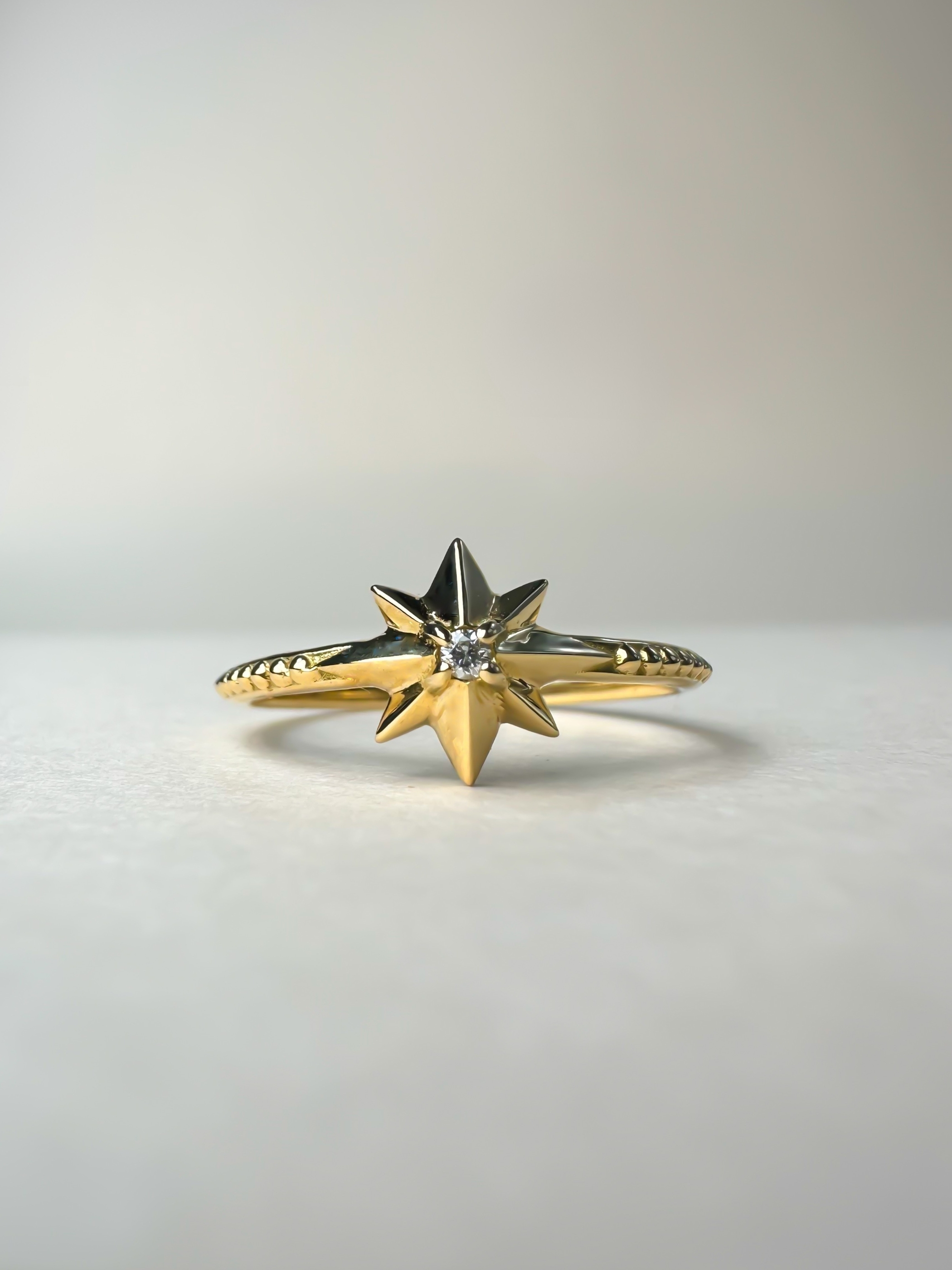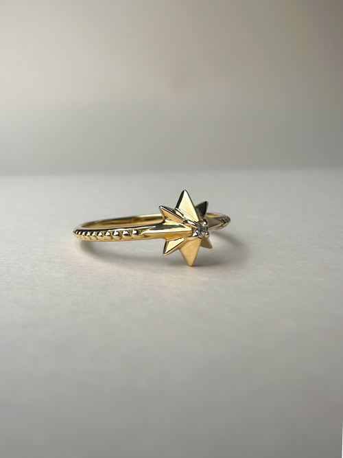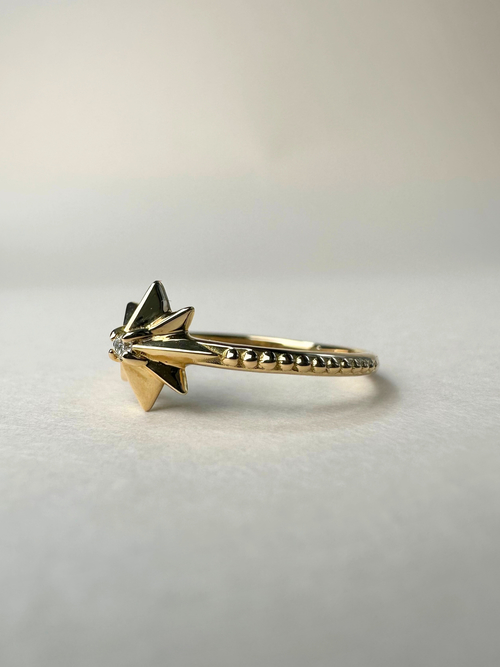 シルエットにこだわった、立体感のある星のモチーフ。アームには繊細なミル打ちを施し、中央には小さなダイヤモンドが一粒輝きます。