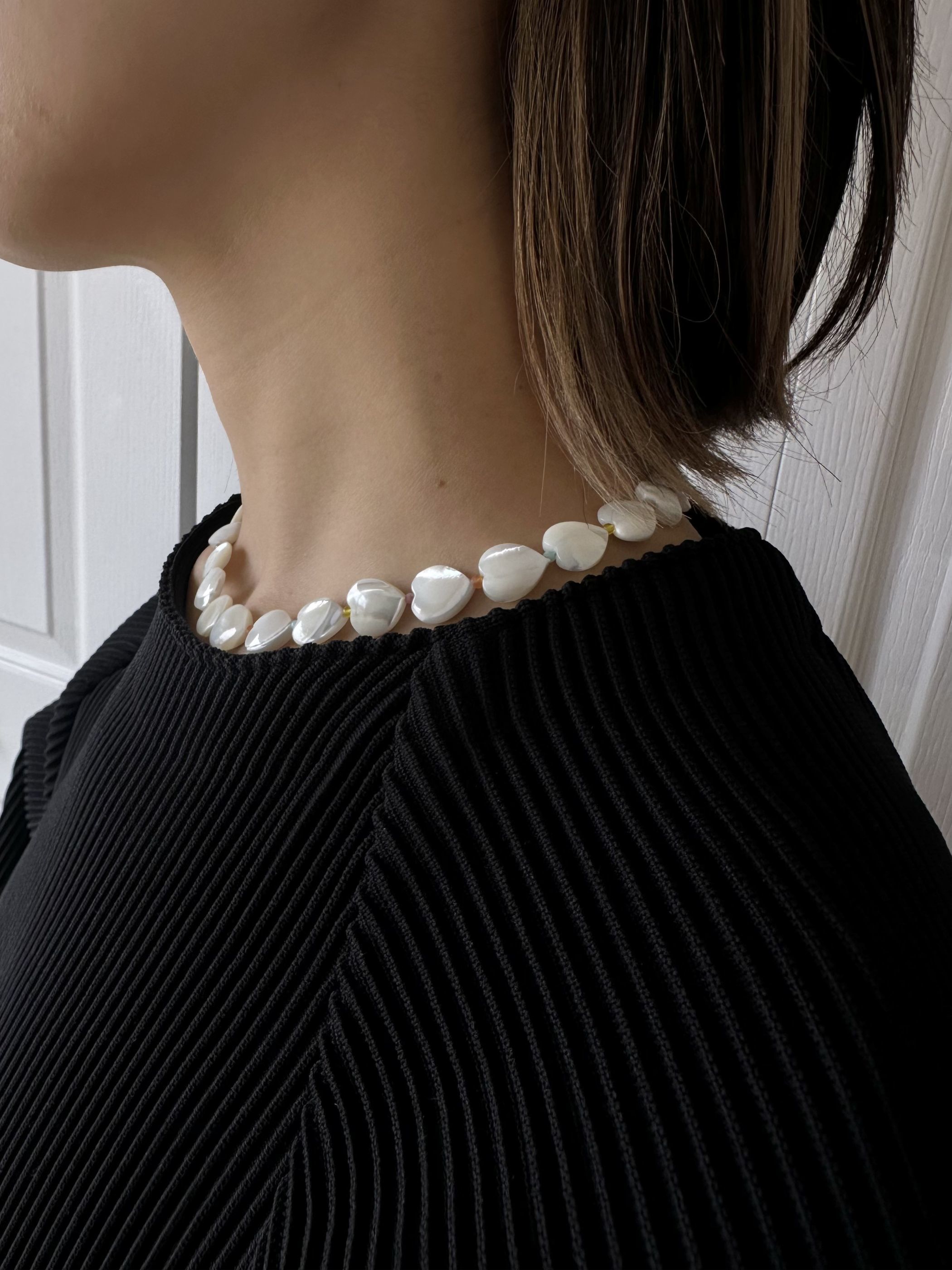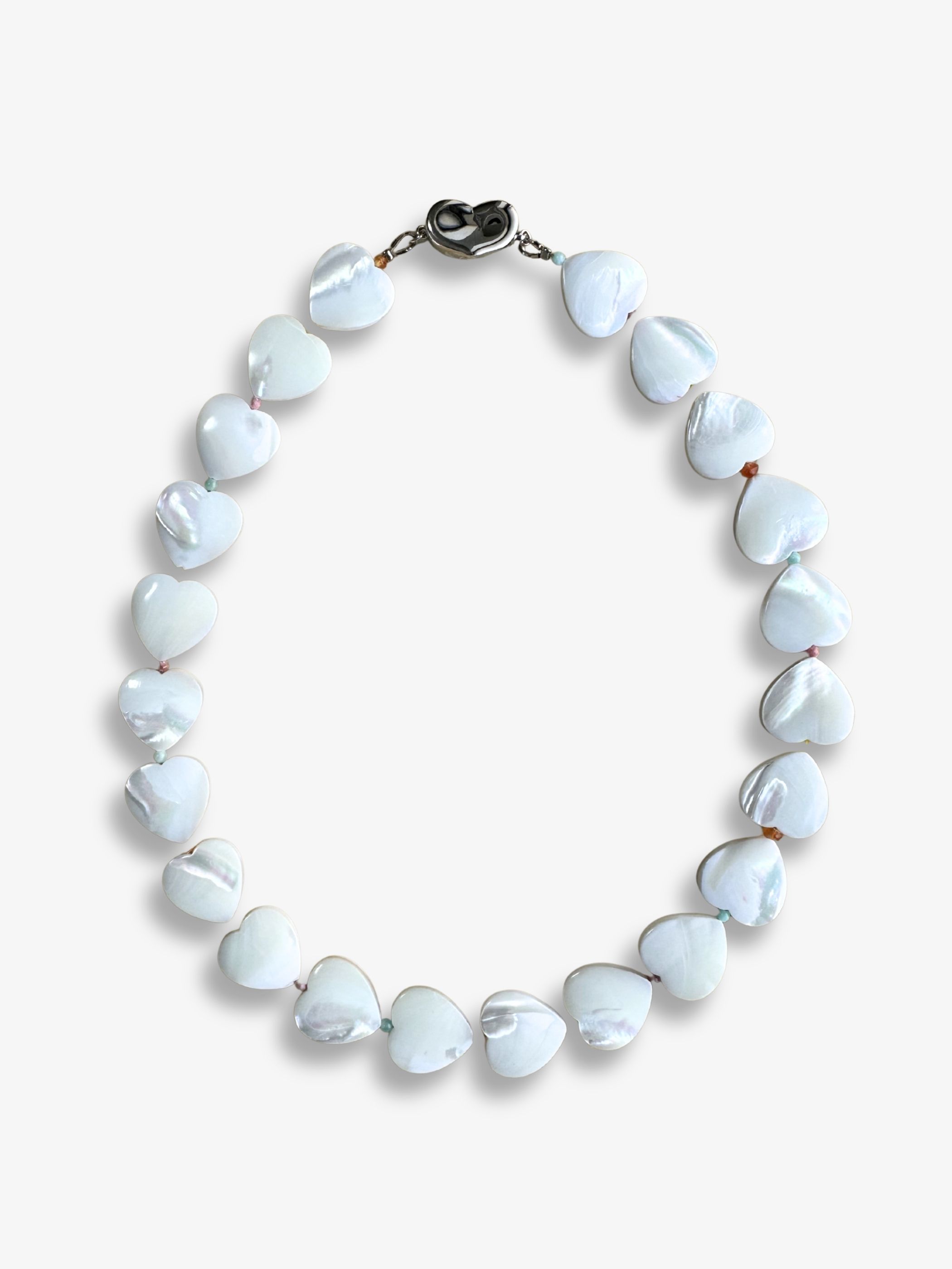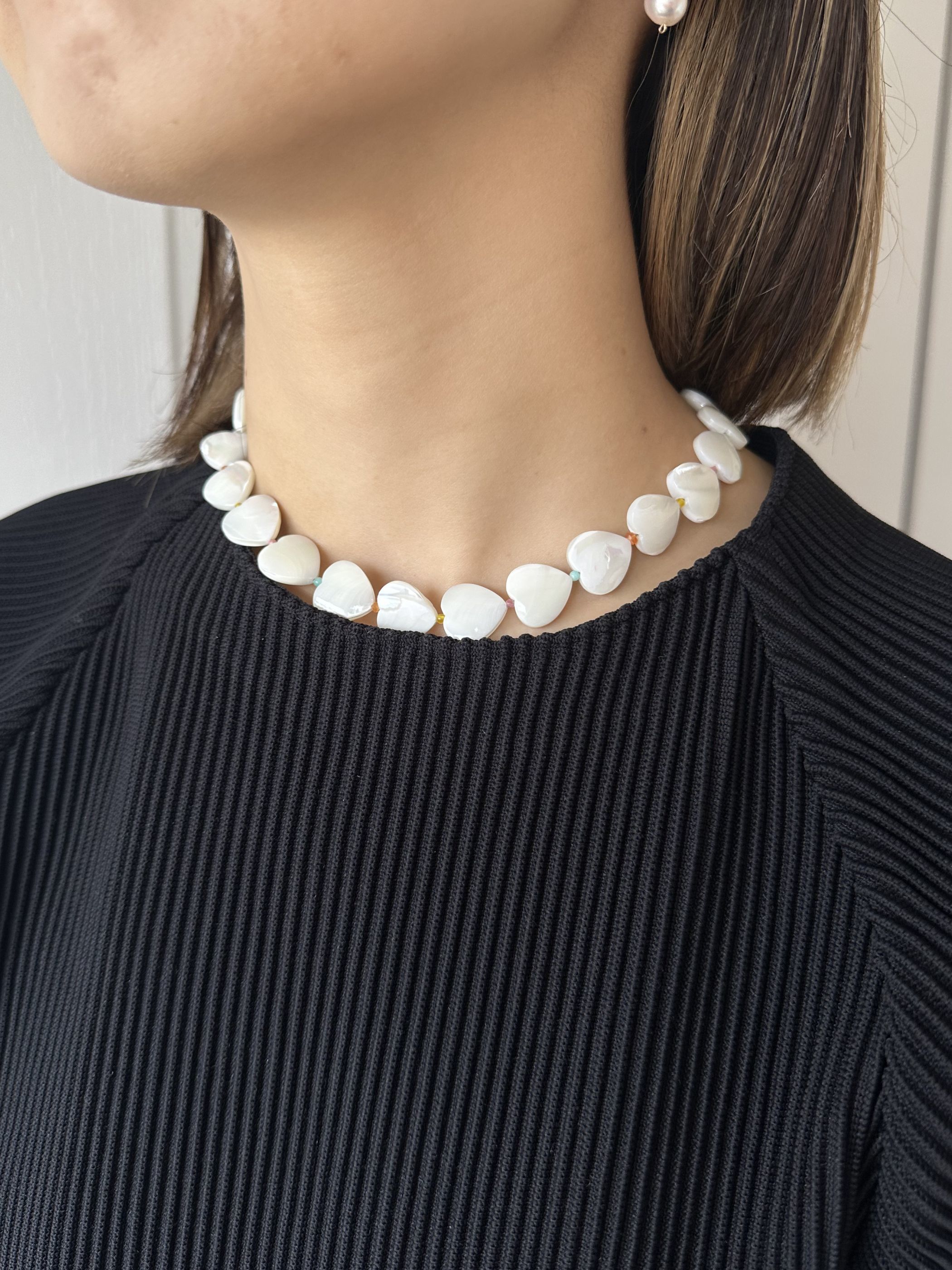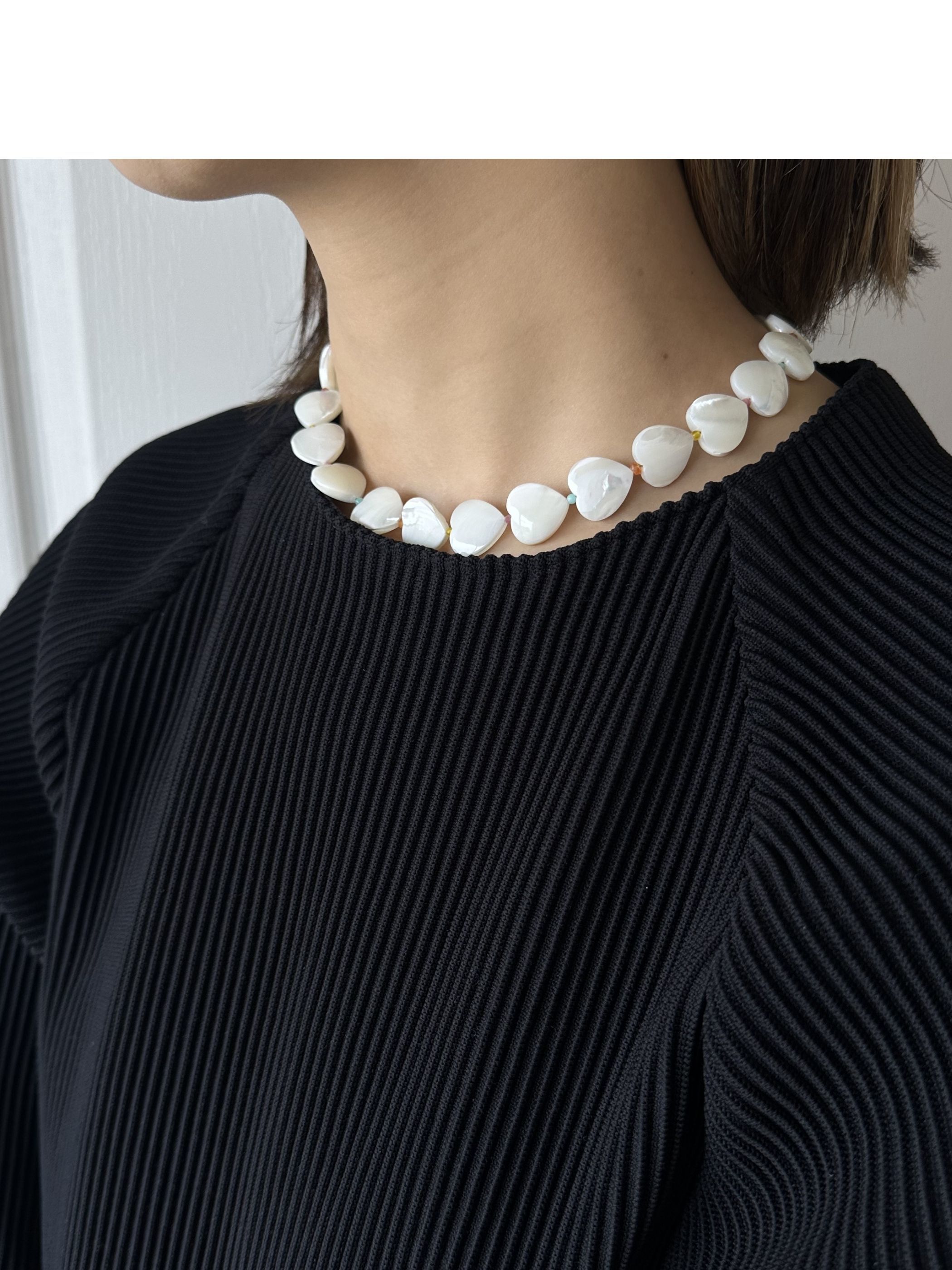 柔らかな色の虹の輝きをたえる、マザーオブパールのハートを連ねたネックレス。間にあしらったカラフルな天然石が、さりげない色のリズムを添えて、表情豊かに仕上げています。