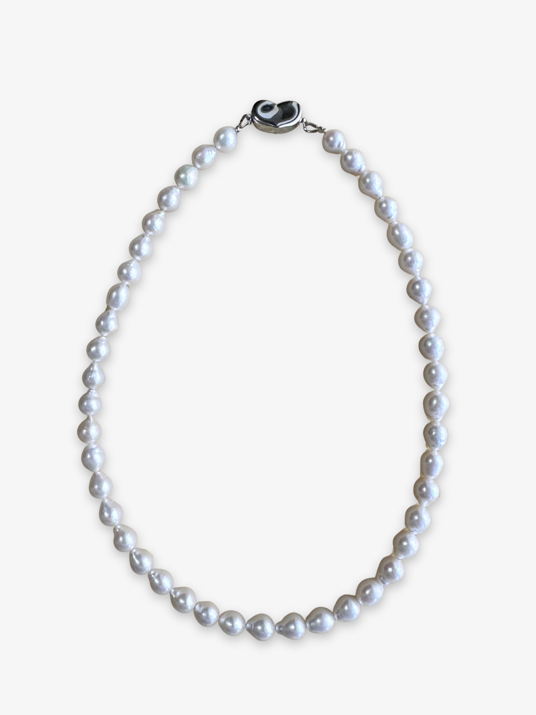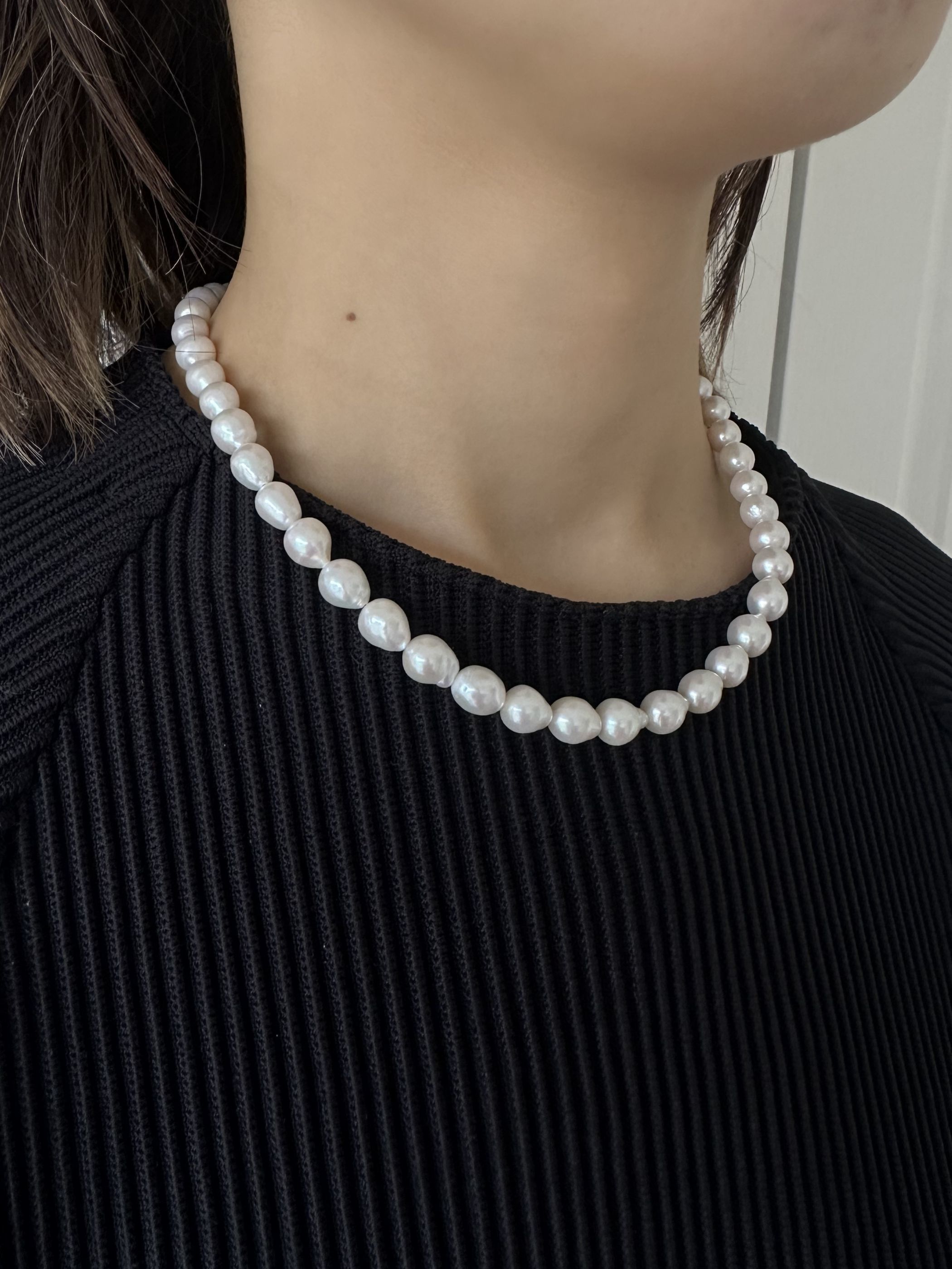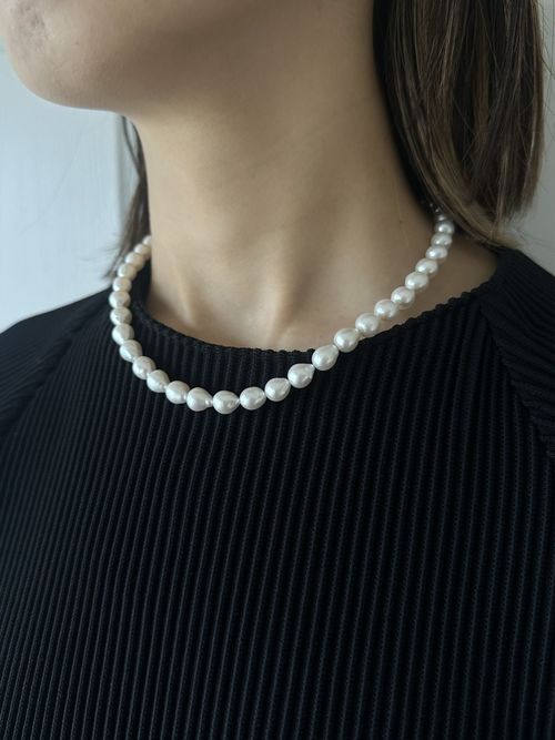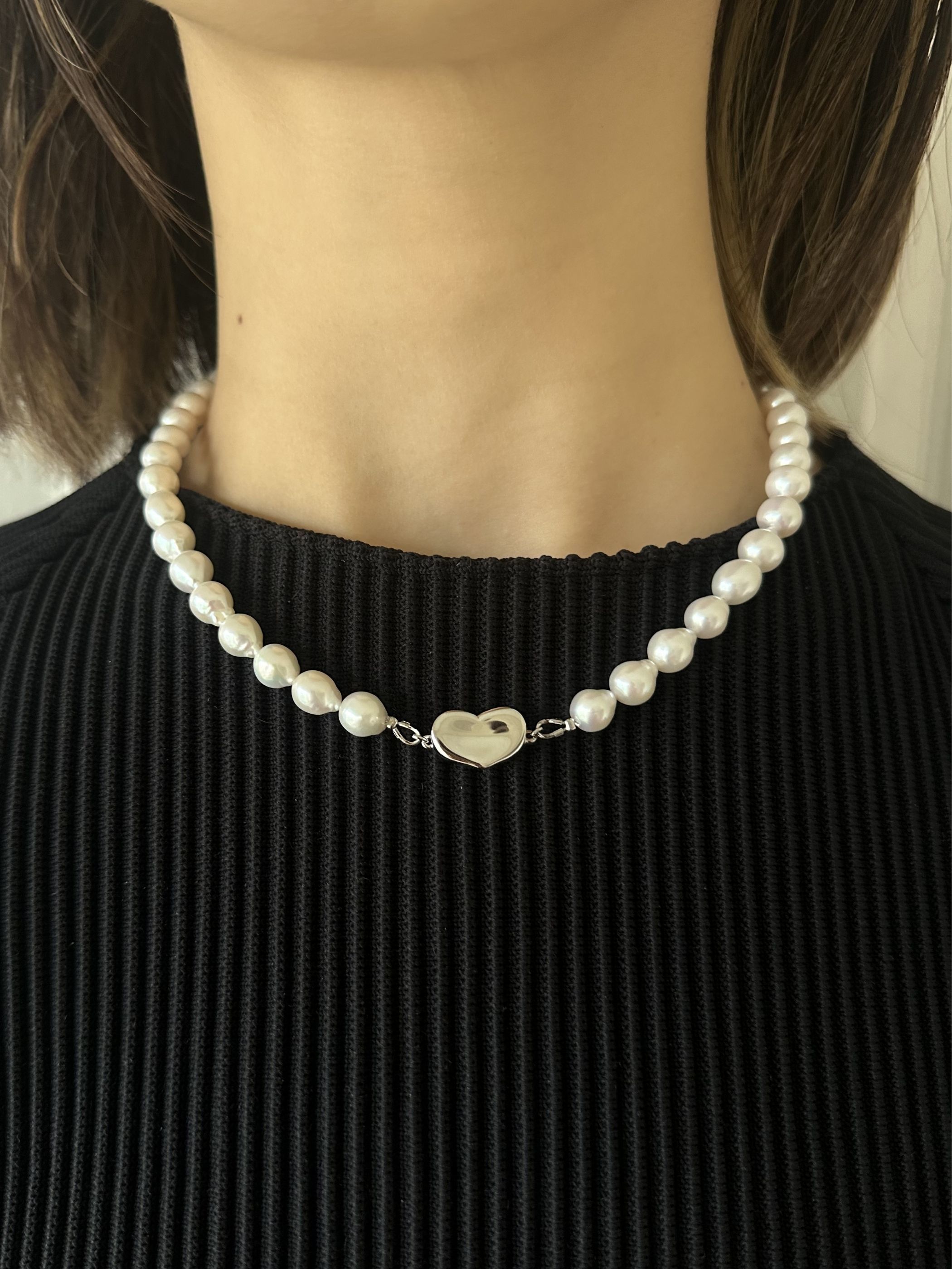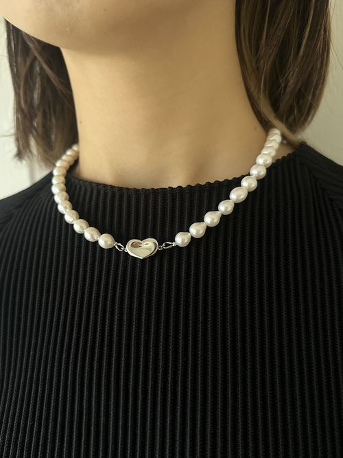 てりの美しい淡水パールを一連に仕立てた、幅広いシーンで活躍してくれるパールネックレス。まんまるではない、少し自然なかたちの淡水パールを選んでいるため、かしこまりすぎず、やわらかな抜け感のある印象でお使いいただけます。ハートの形が可愛い留め具は後ろに留めるのはもちろん、前につけてもさりげないポイントに。