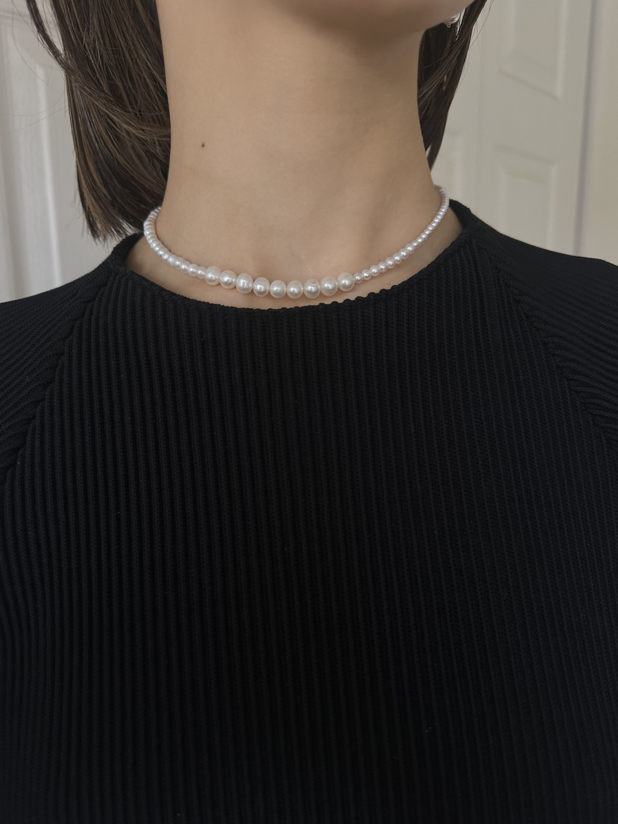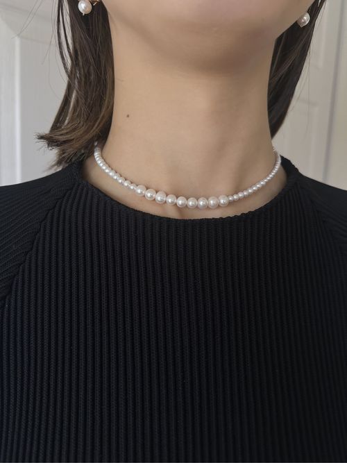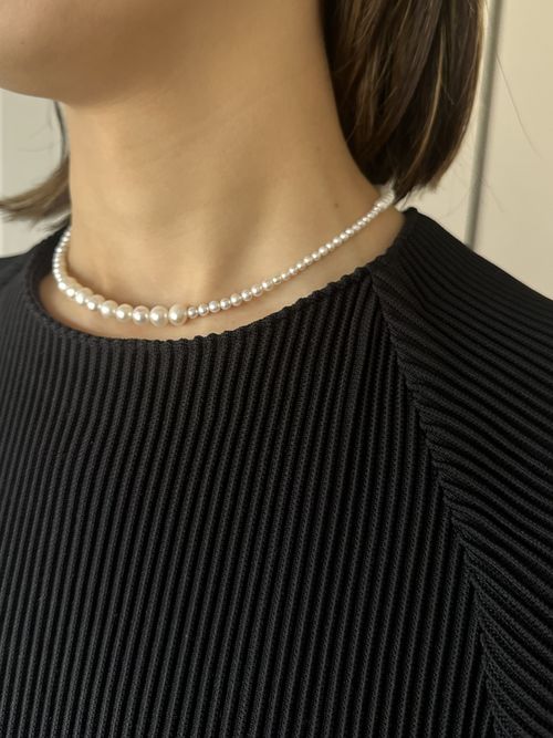 大きさの異なる淡水パールをリズミカルに配置し、軽やかで表情豊かに仕上げたネックレス。シンプルな装いにも、やわらかな華やかさを添えてくれます。